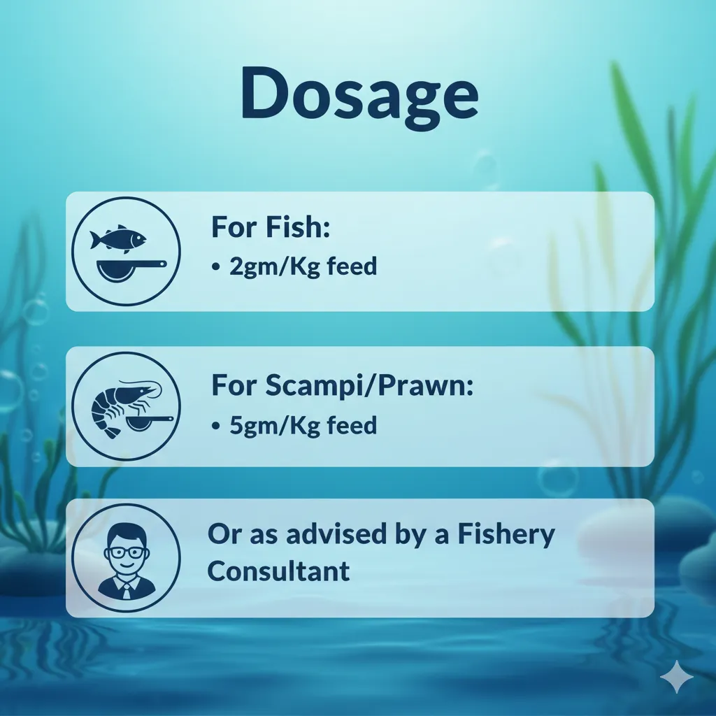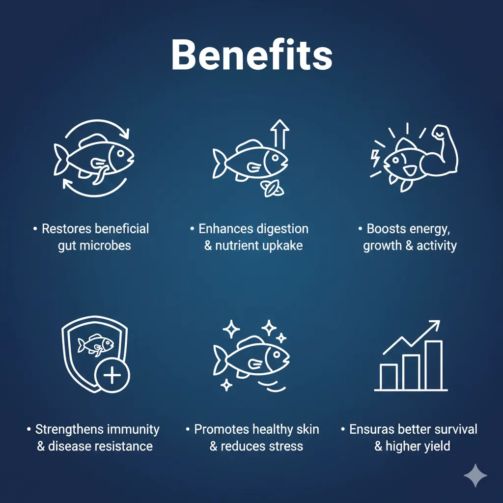 - Scientifically formulated probiotic blend for aquaculture gut health.